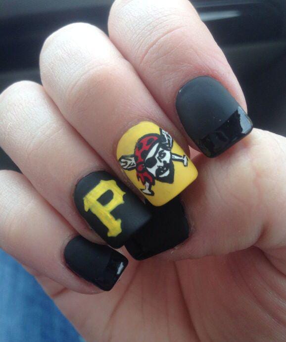 Bold black nails with yellow accents, featuring the Pittsburgh Pirates logo for a sporty pirate-inspired look.