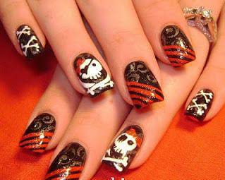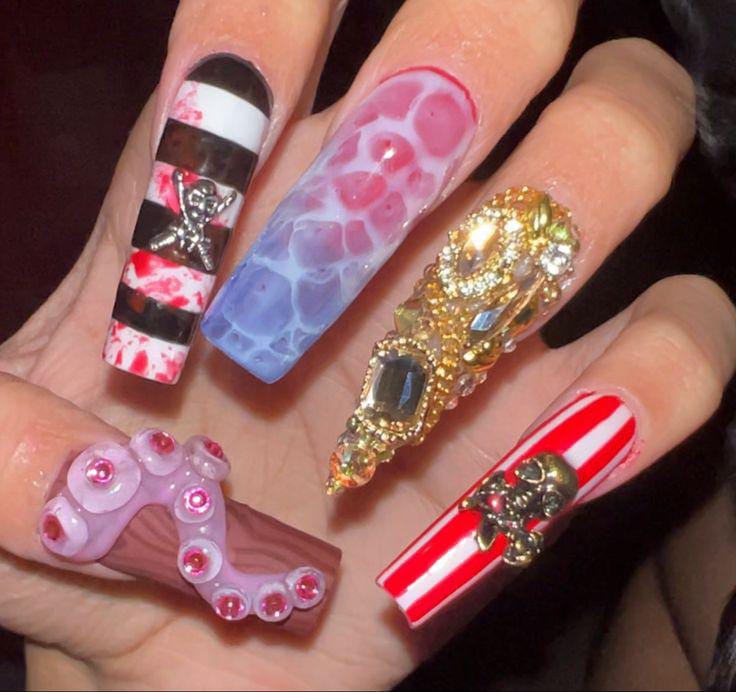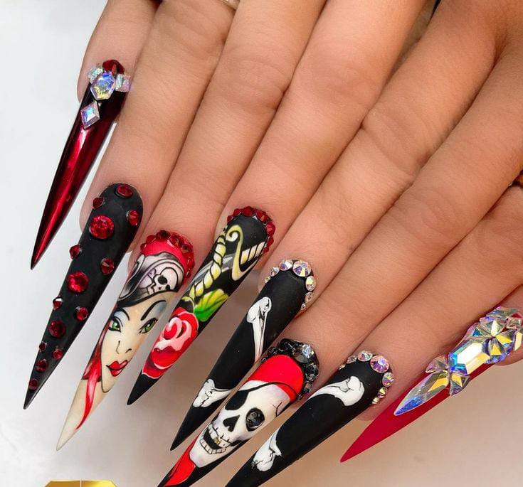 Extra-long stiletto nails with jeweled accents, bold pirate faces, skulls, bones and bright red details for a dramatic style.