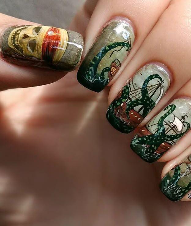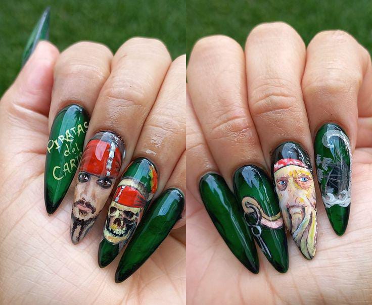 Dark green, dramatic nails featuring painted jack sparrow and davy jones art with skulls for a cinematic, Pirates of the Caribbean feel.
