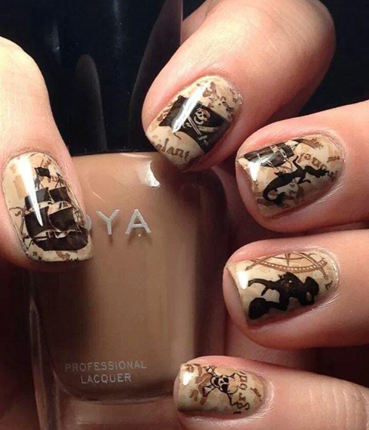 Neutral nails with golden map-like backgrounds and black pirate symbols for a vintage, adventurous feel.