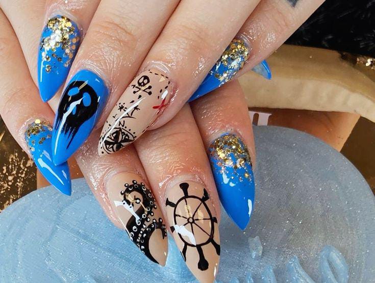 Bright blue and sandy beige nails with compasses, ship wheels, octupus and gold glitter, capturing the spirit of sea adventures and pirate’s vibe.