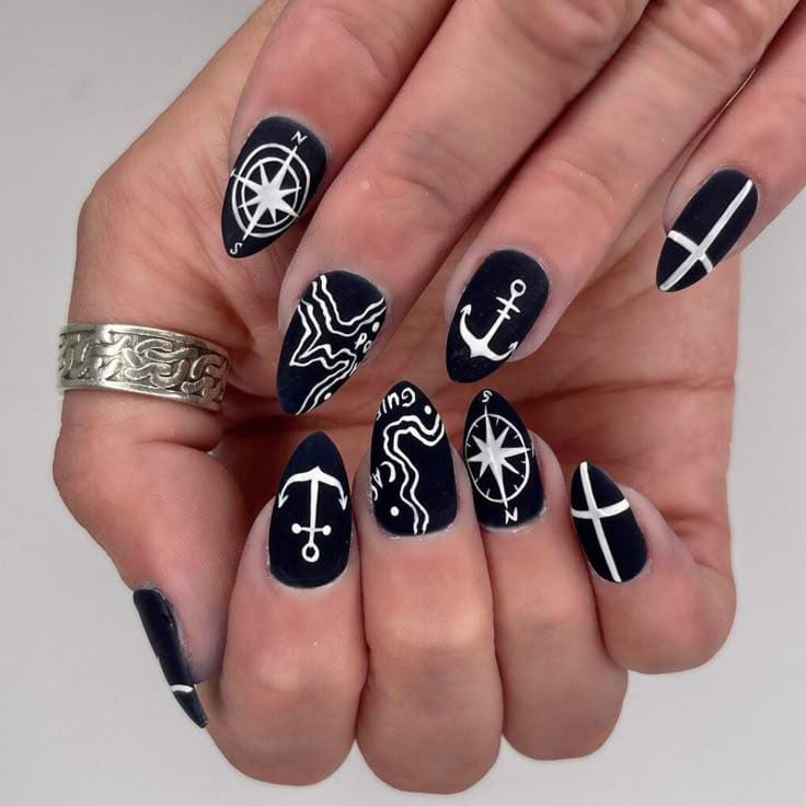 Matte black nails with white anchors, maps, and compasses for a sharp, sailor-inspired pirate vibe.