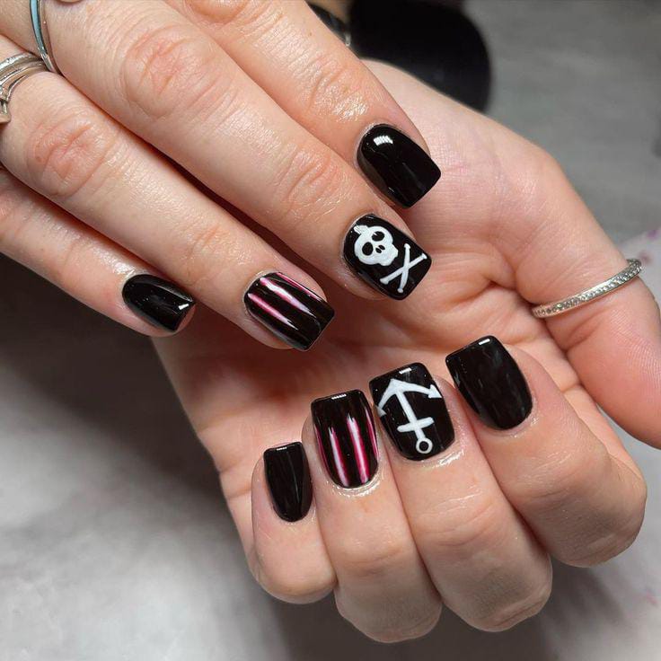 Glossy black nails accented with white pirate skulls, anchors, and bold metallic stripes for an edgy high-seas look.