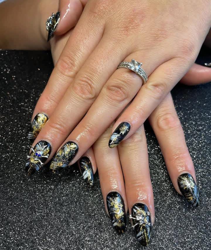 Black and red nails with glittery swirls and bold skull accents, giving off a gothic pirate vibe.