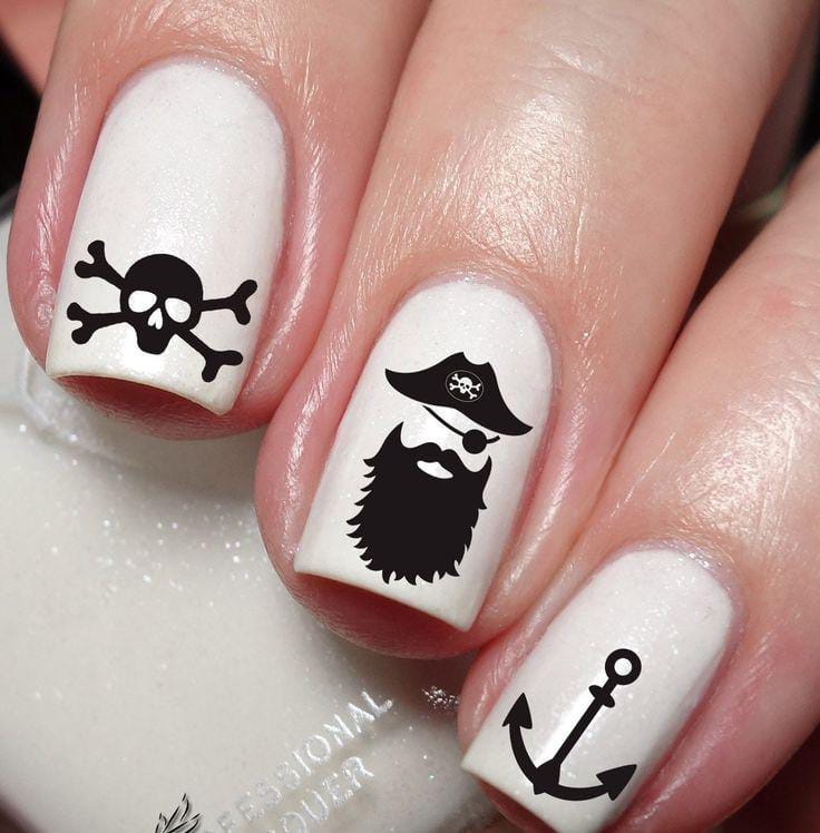 Crisp white nails with bold black pirate icons like a skull, anchor, and bearded captain silhouette for a clean but striking pirate style.