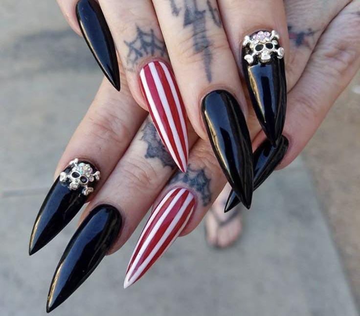 Long stiletto nails in bold black with red-and-white stripes and jeweled skull pirate look, accents for a dramatic, fierce vibe.