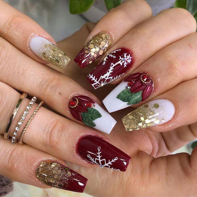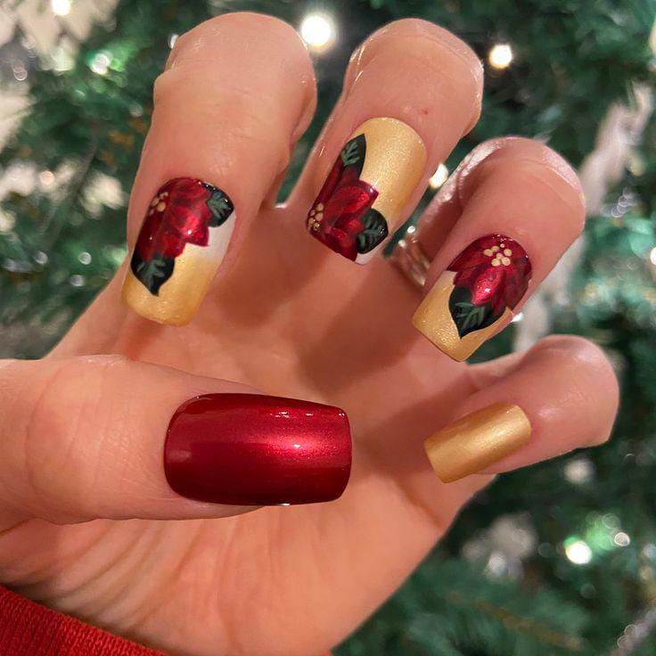 Deep red polish pairs with glittery gold accents and delicate poinsettia art on white nails, creating a traditional Christmas-inspired mix of elegance and sparkle.