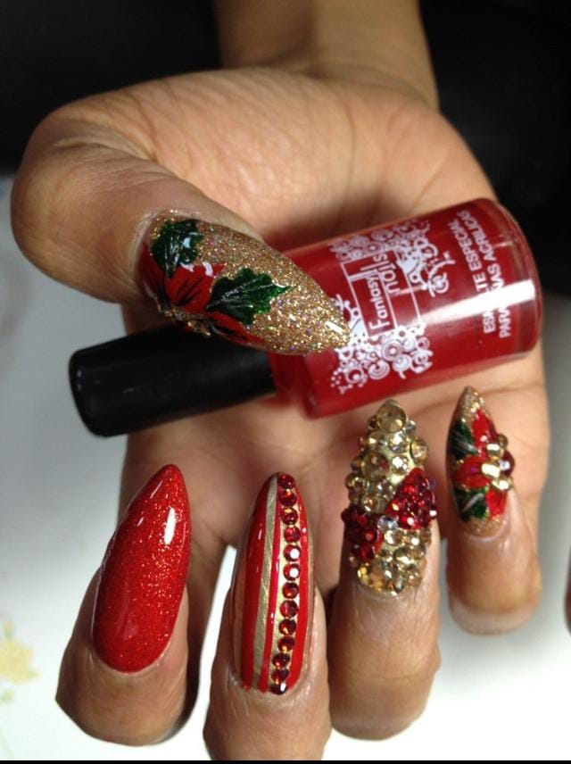 This dramatic set features deep red and gold tones, rhinestone-covered accents, and bold poinsettia artwork, giving the nails a rich, jewel-like holiday glamour.