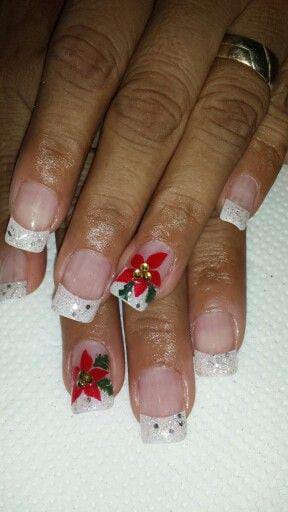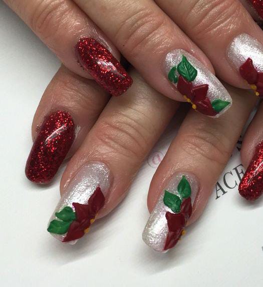 This design mixes clear acrylic tips with sparkling silver accents and bold 3D red poinsettias, giving the nails a festive, frosty-chic look.