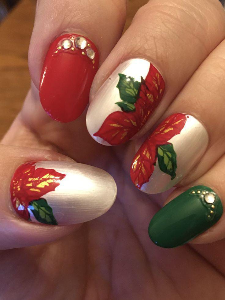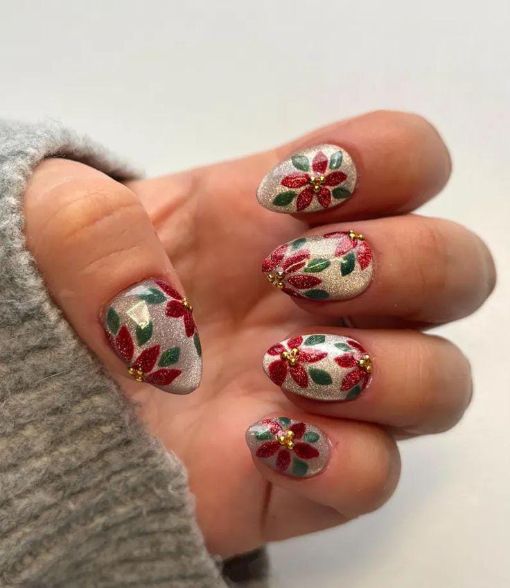 Featuring a mix of red, silver, and green nails, this design showcases hand-painted poinsettias with touches of gold detailing. It gives a very traditional Christmas look with a polished, cozy feel.