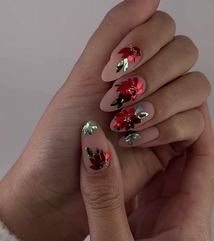 This set has a soft matte nude base decorated with reflective red and green metallic poinsettia shapes that catch the light beautifully. The design feels modern, sleek, and festive without being overly bold.