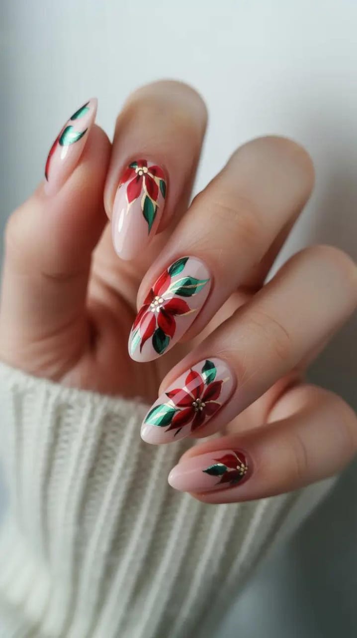 This design features a soft nude base with delicate red and green poinsettia flowers, giving the nails a light, elegant, and feminine holiday feel.