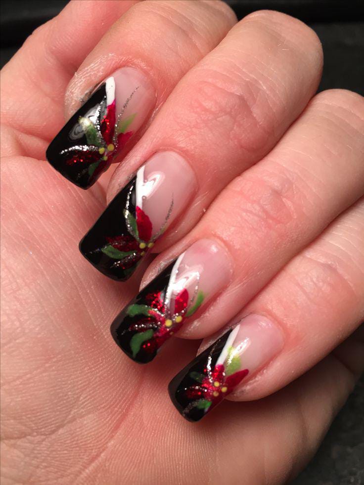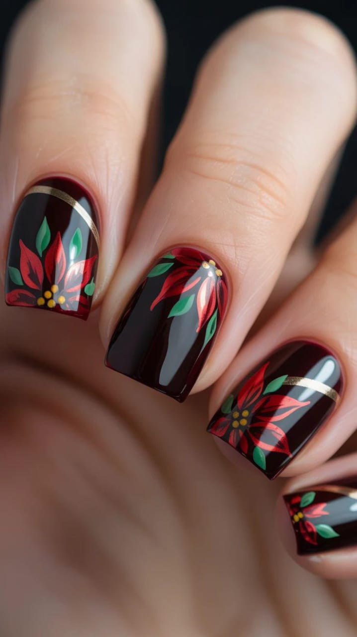 Black-tipped nails with soft nude bases, decorated with painted poinsettias and subtle shimmer, creating a dramatic yet elegant holiday vibe.