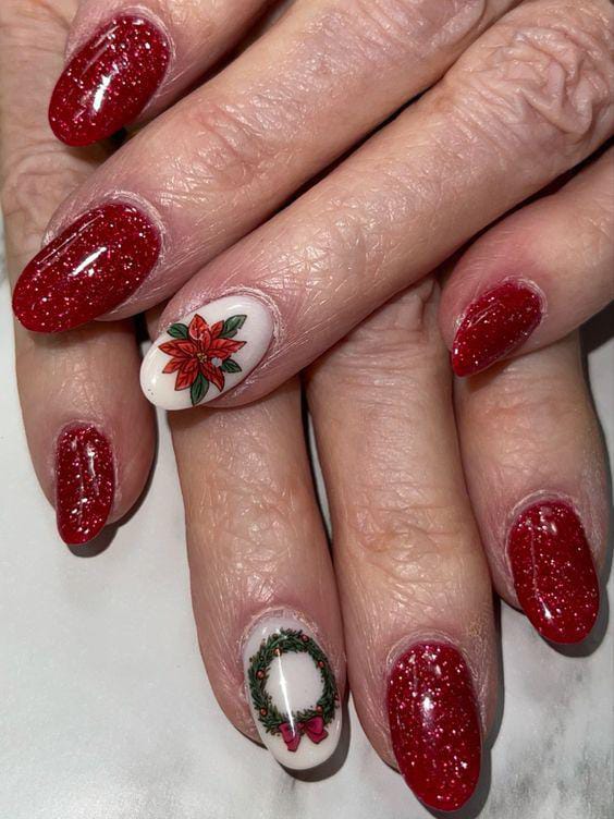 Glittery red nails are paired with soft white accent nails featuring a poinsettia and a small wreath, giving the whole look a cozy, traditional Christmas feel.