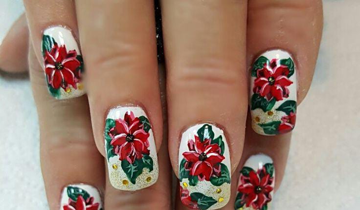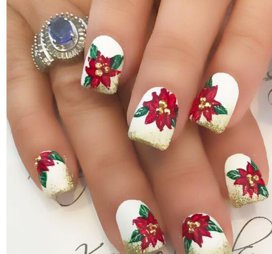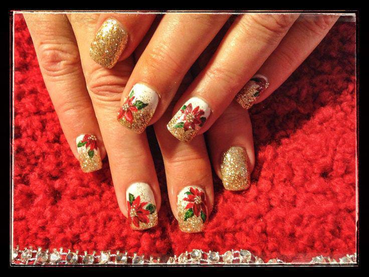 White nails sprinkled with gold glitter and topped with classic poinsettia flowers give this design a snowy, sparkling, and elegant holiday look.