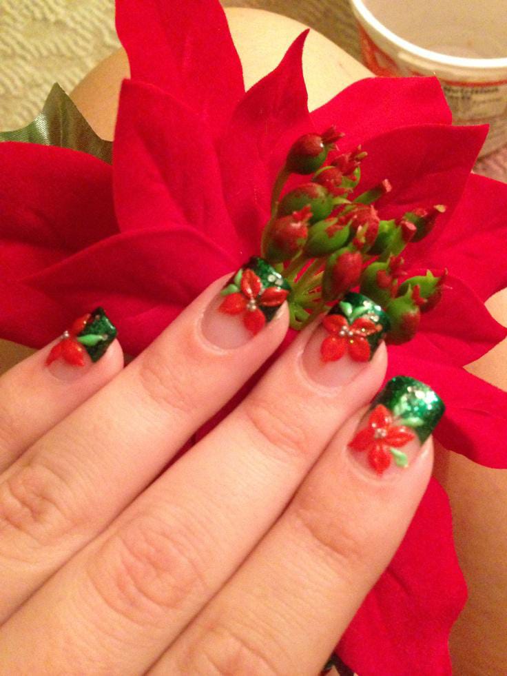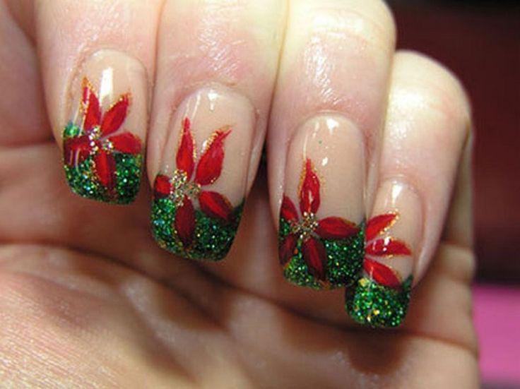 Nude nails get a festive upgrade with green glittered French tips and bright red poinsettia blooms. The contrast between the natural base and bold colors gives it a cheerful, garden-inspired holiday look.
