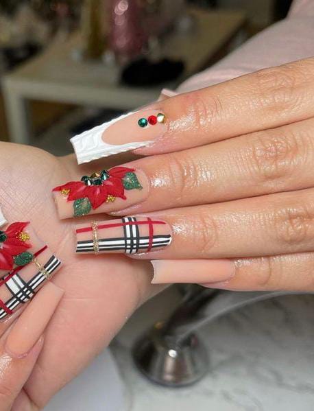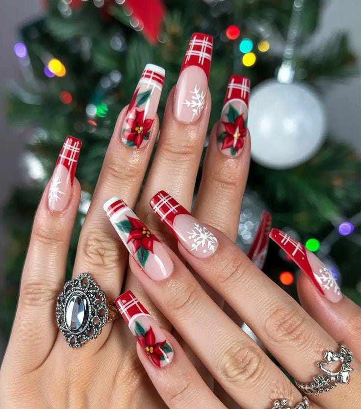 Long nails decorated with red plaid tips, poinsettia art, and delicate snowflakes create a bold and stylish Christmas combination. It’s a vibrant, eye-catching look that blends classic holiday patterns with modern flair.
