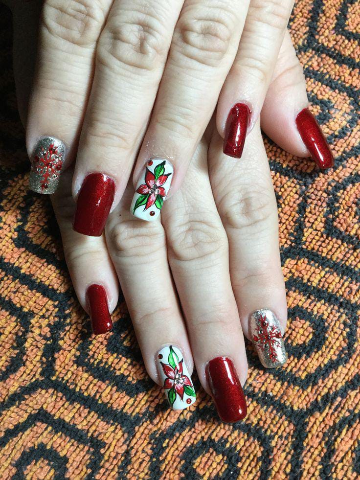 This design showcases deep ruby-red nails adorned with hand-painted poinsettias, complete with gold accents that give the whole look a rich, festive shine.
