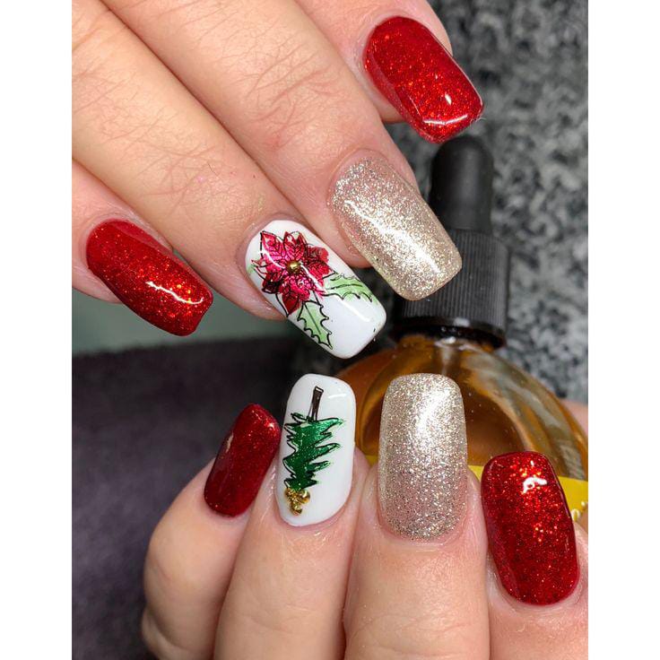 A blend of red glitter nails, gold shimmer, and white accent nails decorated with poinsettias and a simple Christmas tree gives this set a playful yet polished holiday feel.