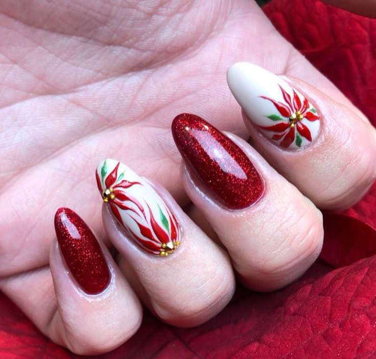 Deep red glitter nails contrast beautifully with white accent nails decorated with swirling poinsettia petals. The fine detailing and tiny golden centers add a touch of elegance to the bold holiday palette.