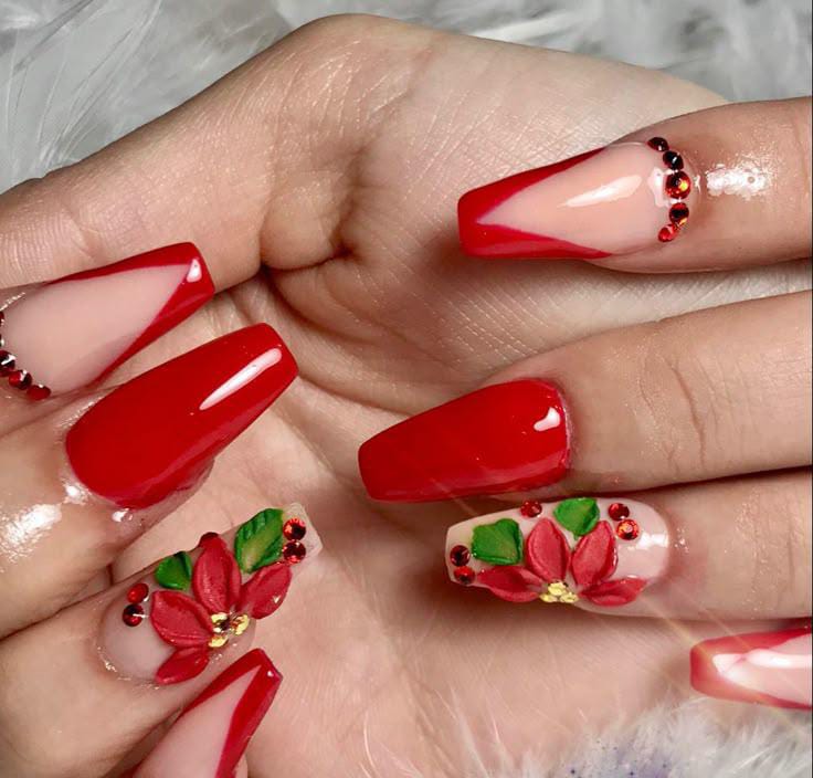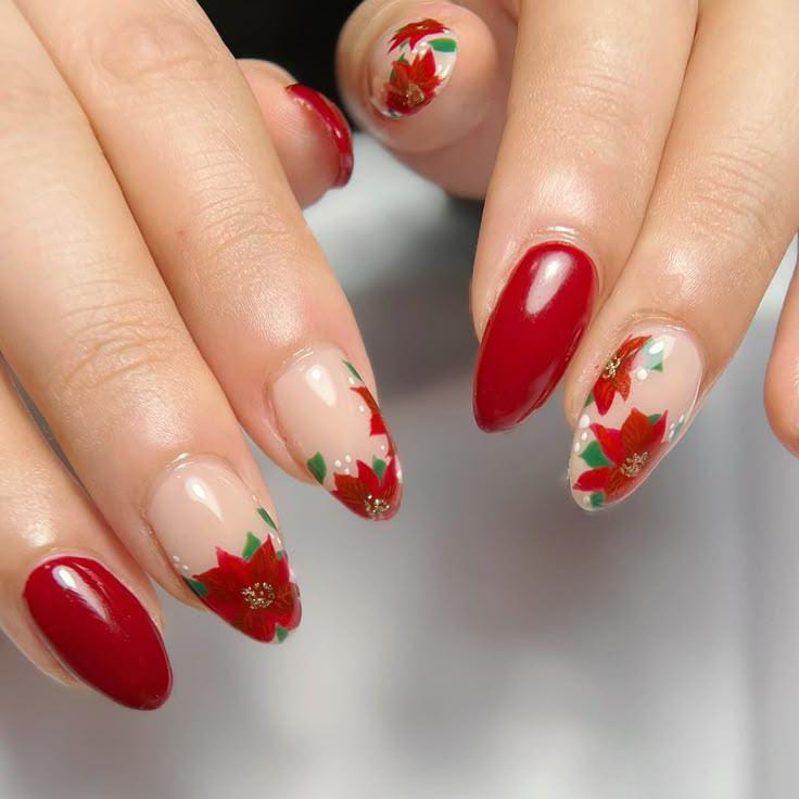 This design pairs rich, glossy red nails with nude-toned accents featuring delicate poinsettia flowers, creating a festive but sophisticated look.