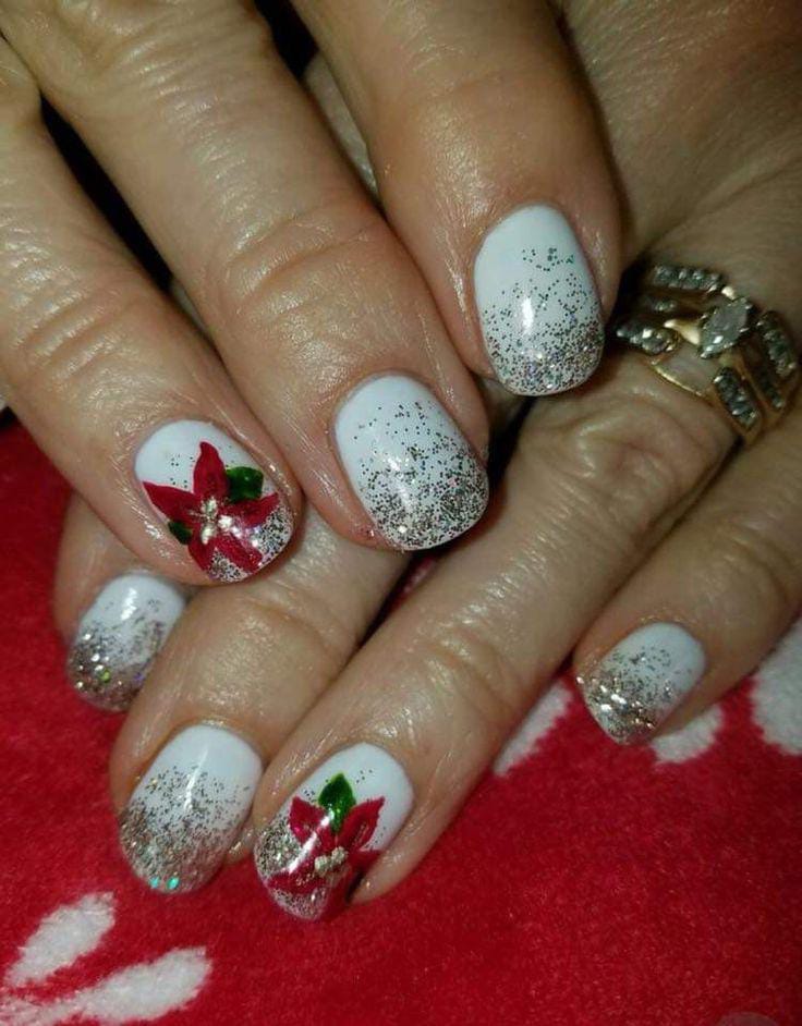 White nails fade into sparkling silver glitter, highlighted with small red poinsettia accents for a frosty, wintery feel. The shimmer adds a soft glow that makes the floral details pop.
