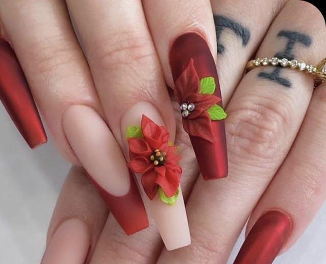 Deep matte red nails pair beautifully with nude accents featuring raised 3D poinsettia flowers, giving the design a dramatic, textured finish.