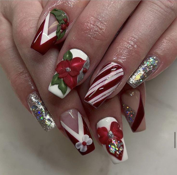 This design pairs bold red glitter nails with shimmering silver ones, each accented by raised poinsettia flowers and green leaves for a festive, textured holiday look.