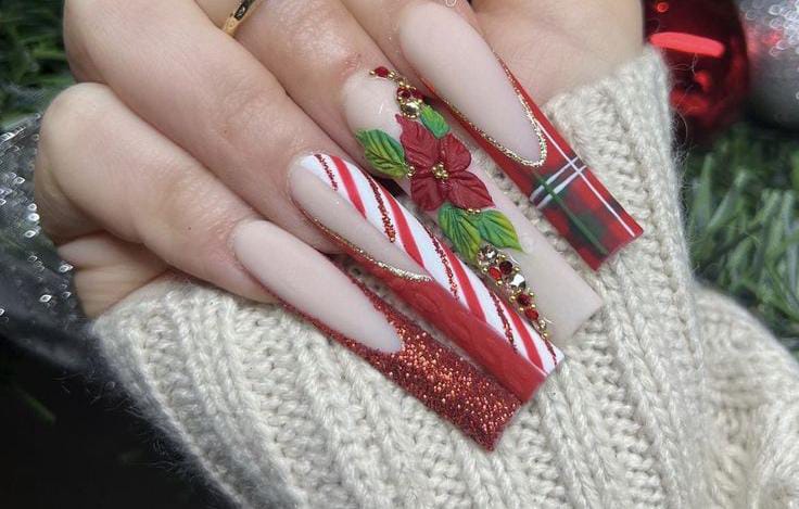 Long tapered nails combine soft matte nudes with candy-cane stripes, tartan patterns, glitter, and a standout 3D poinsettia. The design feels warm, festive, and beautifully balanced for the holiday season.