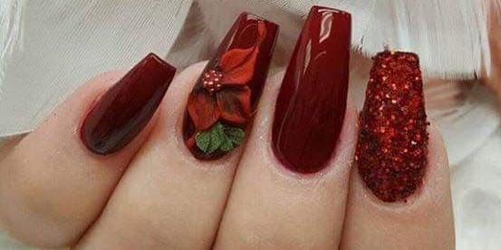 A deep wine-red manicure with glossy long nails, highlighted by a bold 3D poinsettia accent and one glitter-packed nail for a rich, festive finish.