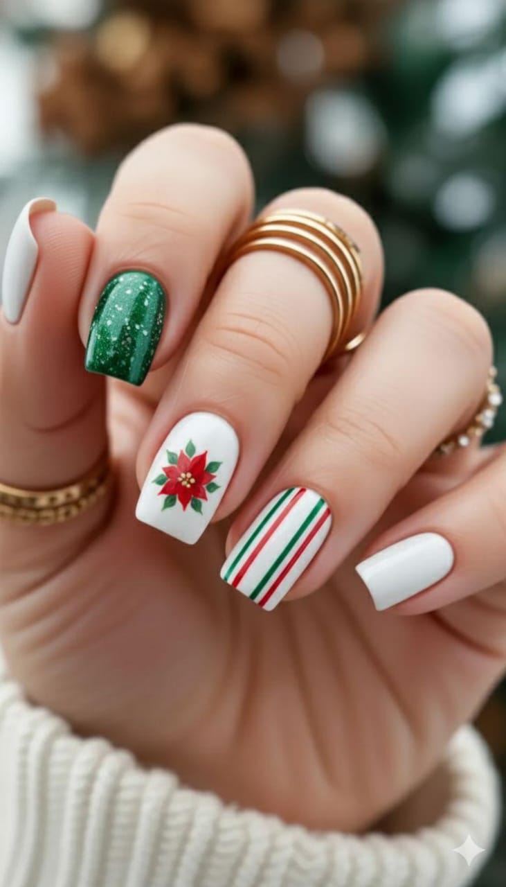 Clean white nails paired with sparkling green and a crisp poinsettia accent, balanced by candy-stripe detailing for a cheerful Christmas look.