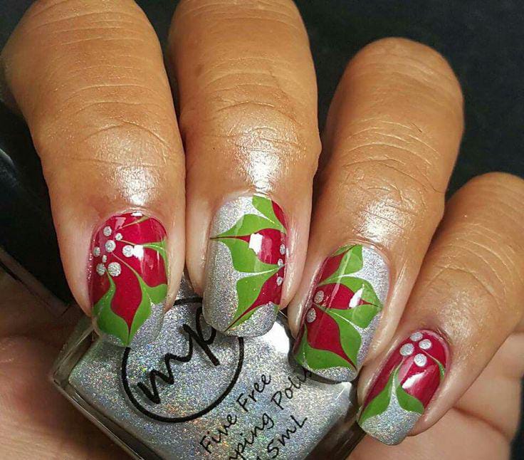 Metallic silver nails accented with red poinsettia petals and bright green leaves, giving a modern, shiny twist to classic holiday florals.