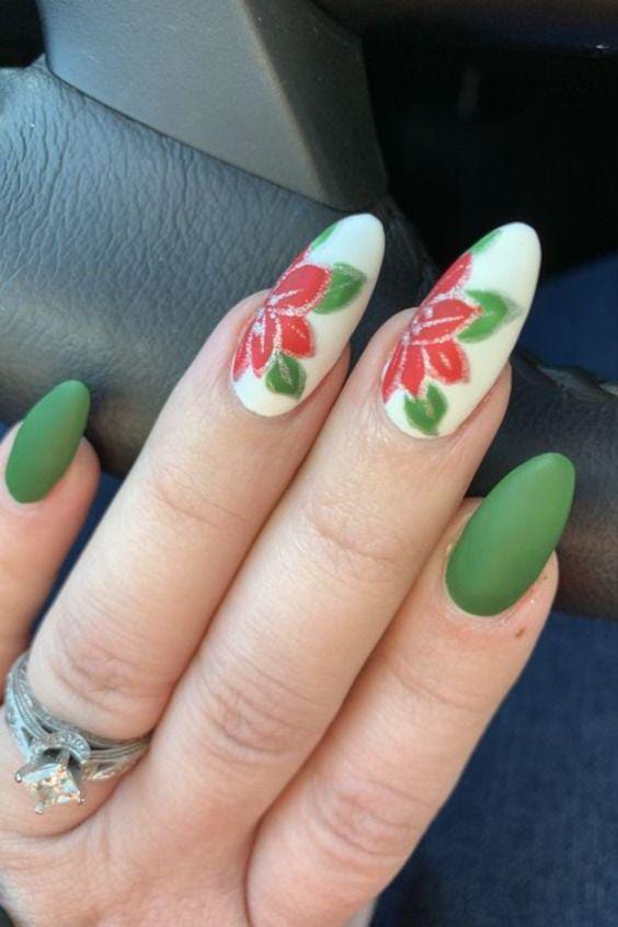 Soft matte green nails are paired with creamy white accent nails, each painted with a hand-drawn poinsettia for a cozy, wintery vibe.