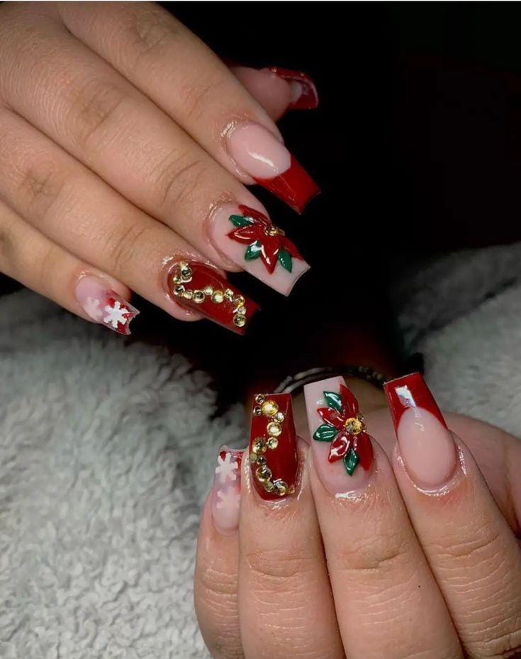 Deep red nails mix with nude panels, 3D poinsettias, and gold embellishments to create a luxurious, festive design full of sparkle and texture.