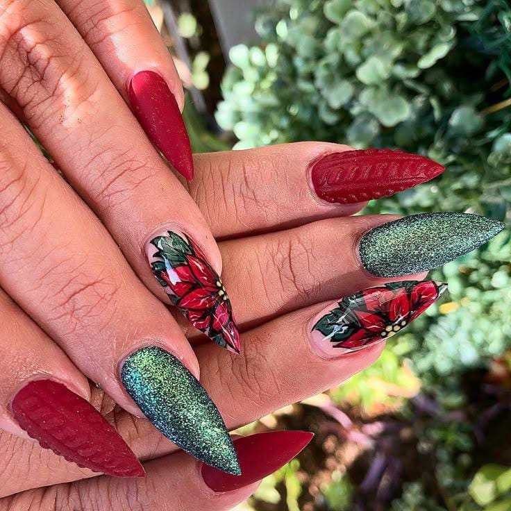 A mix of matte red, shimmering green, and detailed poinsettia art creates a bold, dramatic holiday style. The sharp stiletto shape and textured finishes add an edgy twist to the traditional Christmas palette.