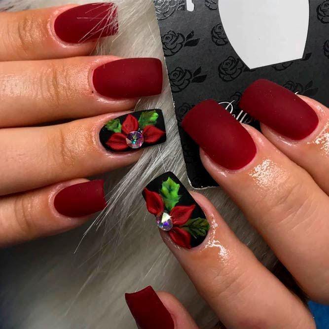 Rich matte burgundy nails contrast beautifully with black accent nails, where vibrant 3D poinsettias and crystal centers add a bold, dramatic holiday touch.