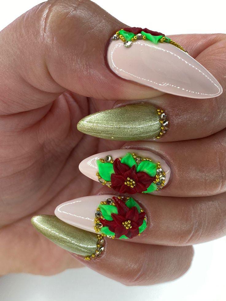 Set over a metallic gold base, these nails feature striking red poinsettia petals and green leaves placed near the cuticle for a bold, festive contrast. The look is rich, warm, and perfect for holiday glam.