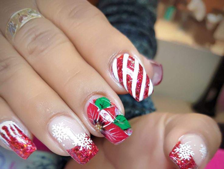 A playful blend of red glitter, candy-cane stripes, snowflakes, and a vivid poinsettia accent nail creates a bright, cheerful Christmas-themed look.