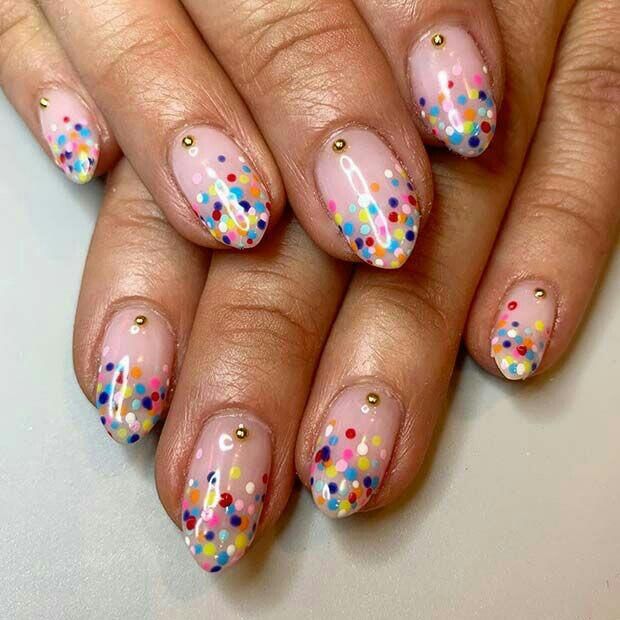 Clear nude nails scattered with colorful dots in rainbow shades, like a festive confetti party at your fingertips.
