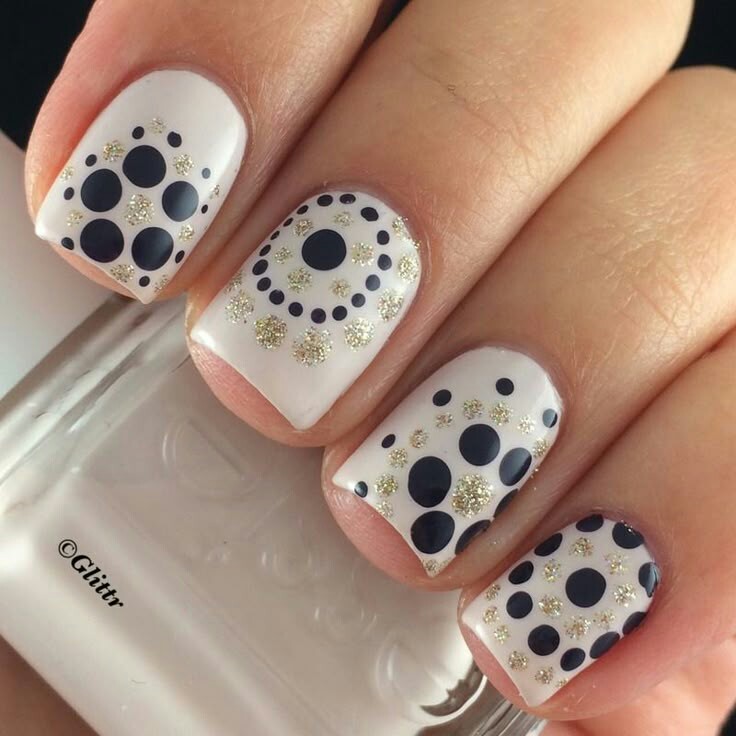 White nails decorated with bold black dots and sparkling golden glitter, arranged in circular patterns for a chic and glamorous look.