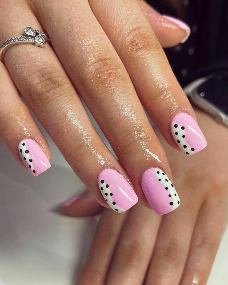 A soft pink with diagonal white swirls, lined with neat black dots for a modern twist on the French manicure.