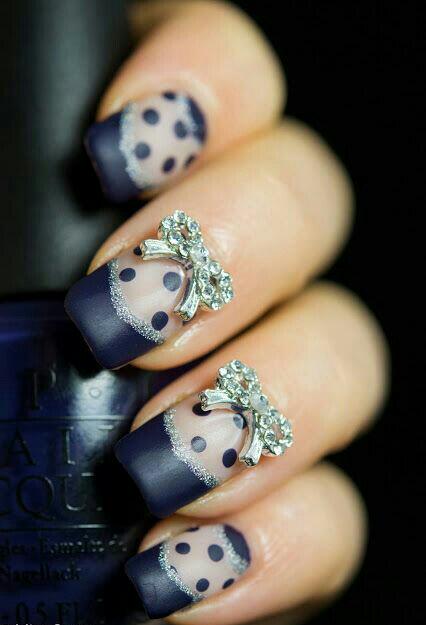 A chic navy French tip with sheer polka dots, finished with sparkling rhinestone bows for a glamorous touch.