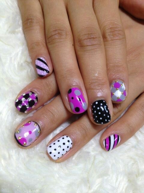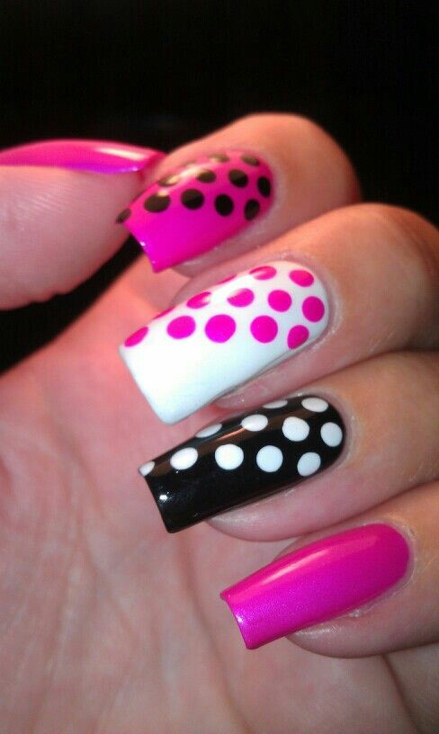 A playful mix of hot pink, white, and black nails, each covered in contrasting polka dots for a fun retro look.
