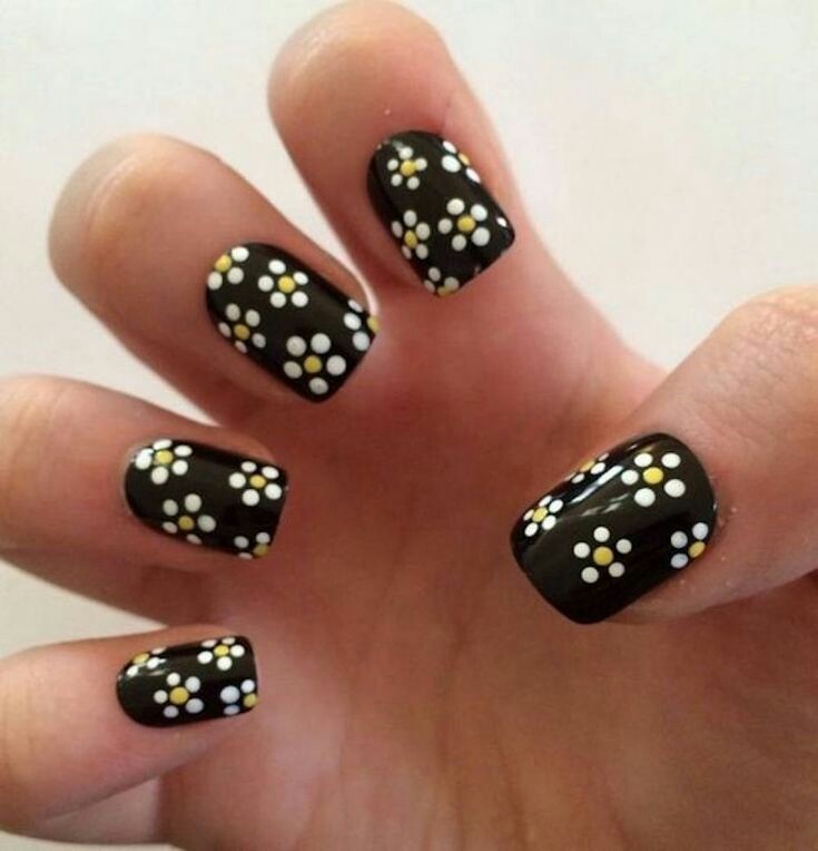 A glossy black base sprinkled with tiny white and yellow daisies, creating a simple yet charming garden feel.