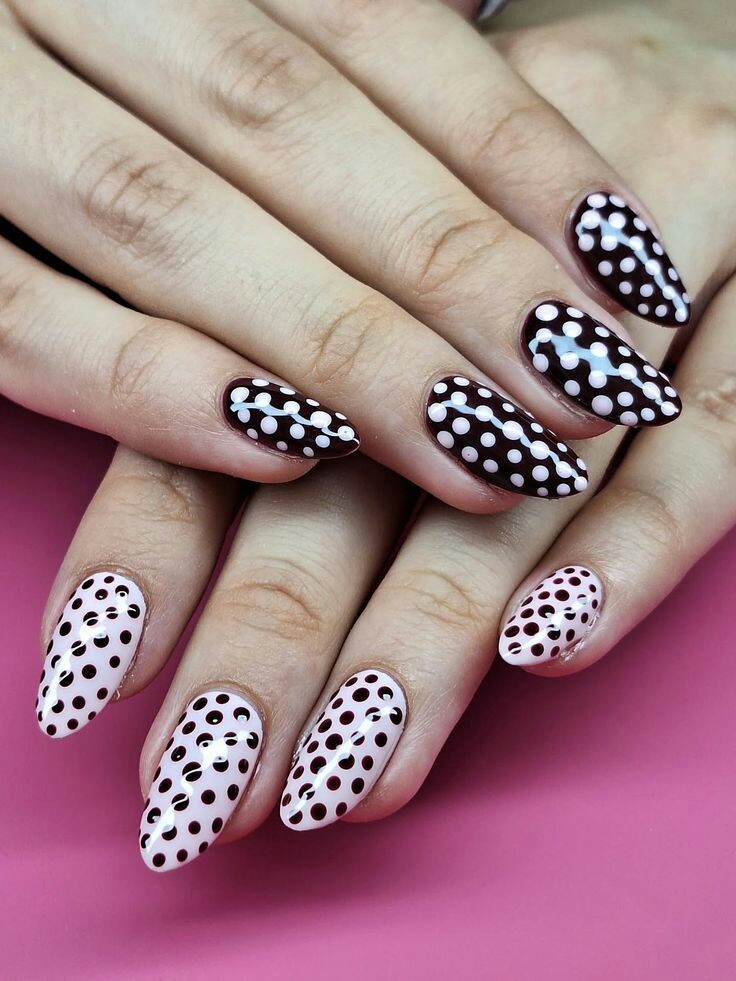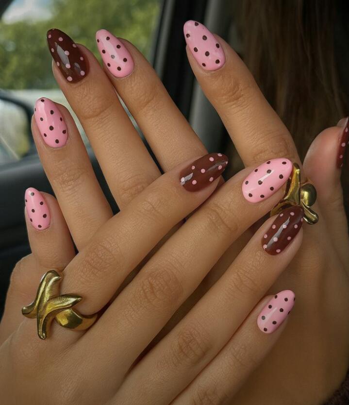Soft pink and rich brown nails alternate with tiny polka dots, giving a sweet chocolate-and-strawberry dessert feel.