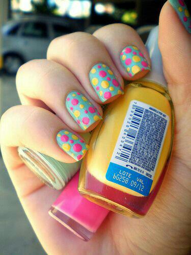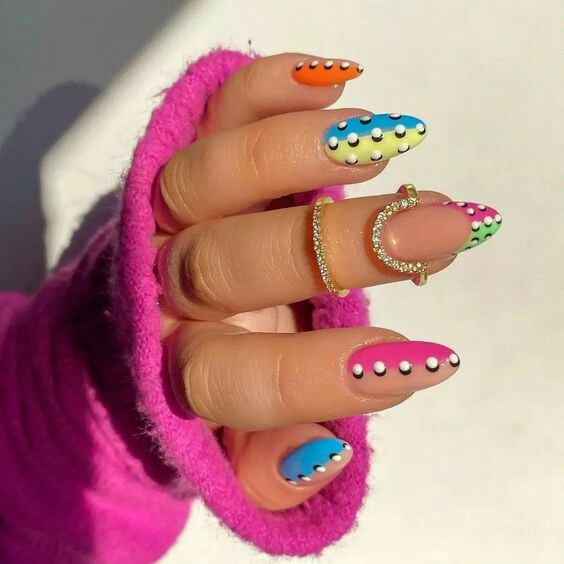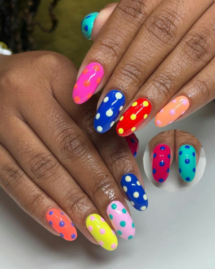 Bright, colorful nails in different shades, each topped with bold polka dots for a lively and cheerful style.