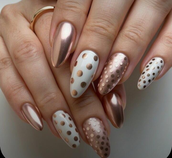 A chic mix of metallic rose gold nails paired with white and nude bases decorated in shiny polka dots, creating a luxe yet playful vibe.
