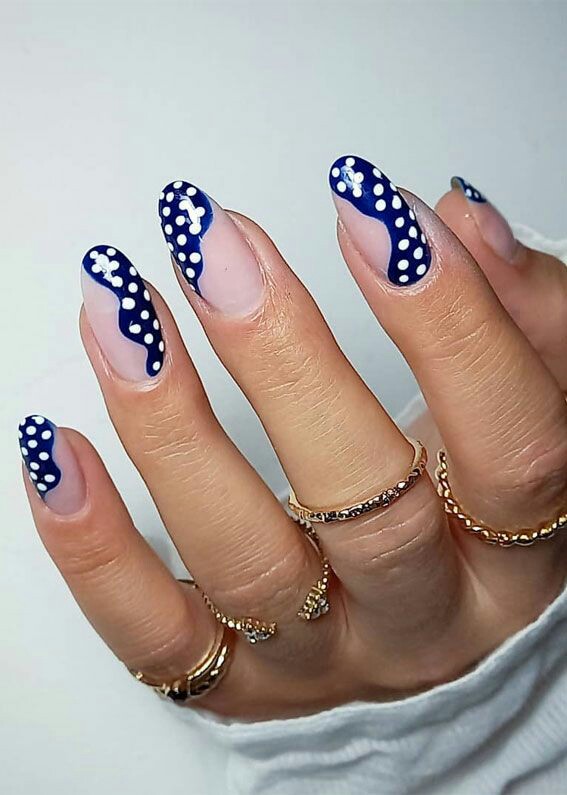 Bold navy waves outlined with playful white dots on a nude base, giving a modern, artistic edge.