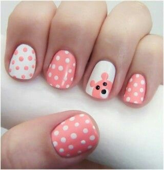 Soft pink and white nails covered in dots, with an adorable teddy bear accent nail that adds a fun, youthful touch.