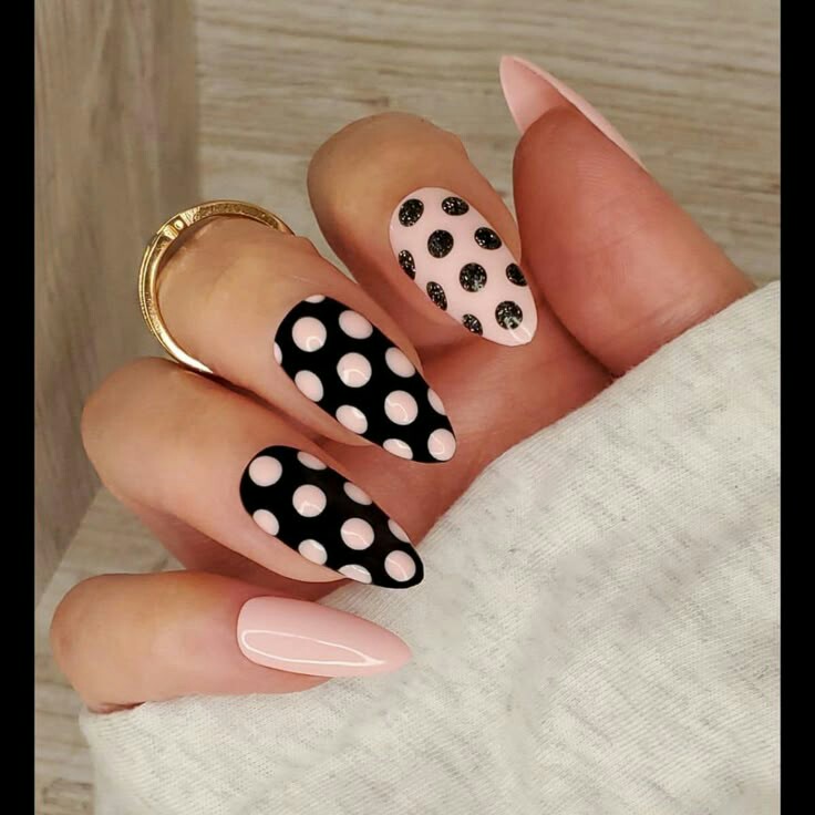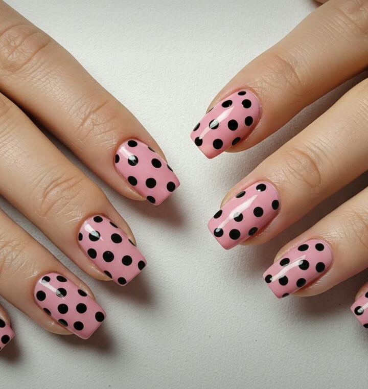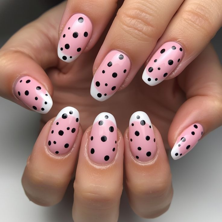 A feminine light pink base with playful black polka dots on tips and accent nails, creating a sweet and minimal vibe.